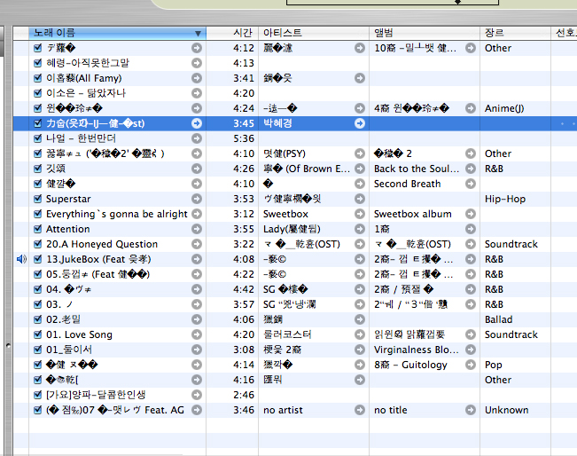 아이툰에 음악파일 복사해서 넣으니 저렇게 알수없는 글자들로 나와요..
